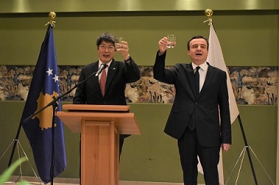 On this occasion, Ambassador IWAMA hosted a reception aimed at promoting economic relations between Japan and Kosovo. In addition to the members of the business mission, distinguished guests from Kosovo also attended, including Acting Prime Minister, Albin Kurti, several members of the economic cabinet, the Mayor of Pristina Rama, and many representatives of the Kosovo business community. At the venue, stands were set up by the Kosovo wineries "Stone Castle" and "Bodrumi I Vjeter", as well as by "Hirano Mushroom", a Japanese joint venture company. Kosovo wines and various types of mushrooms, such as SHIITAKE and ERINGI, were exhibited.